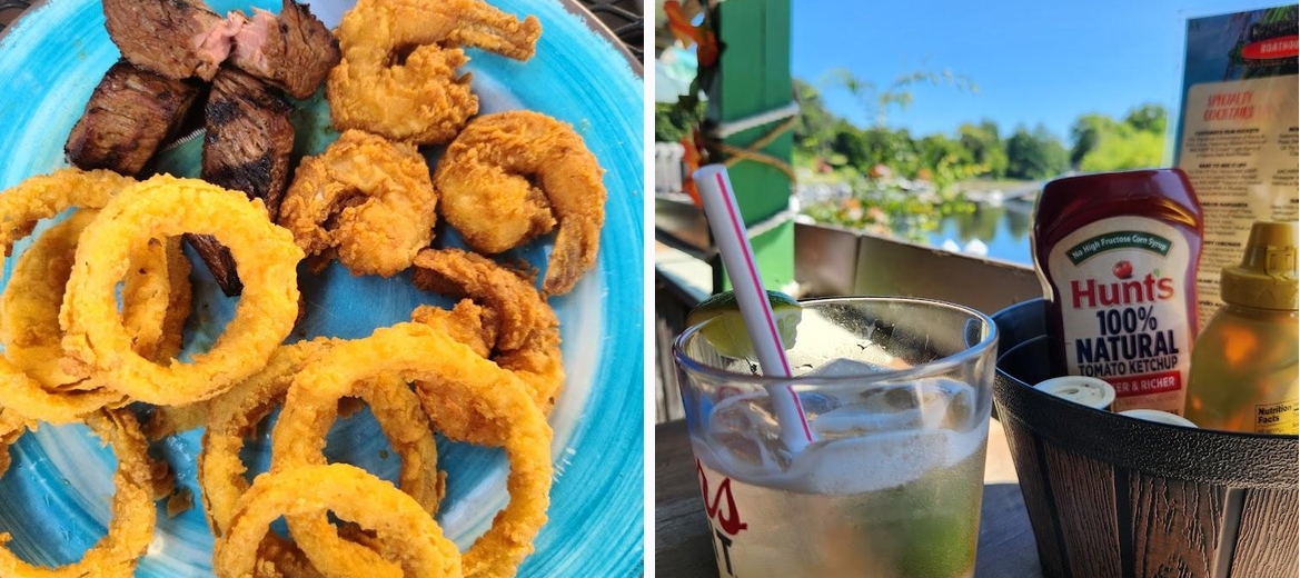 Nice outdoor dining right on the river . Onion rings we're best I've had in a long time. Waitress was on her own and did fantastic. No complaints about the food and drinks